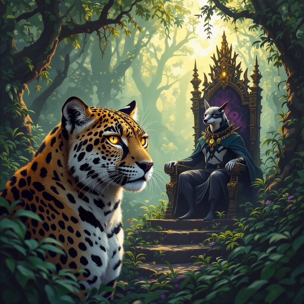 Among those who had seen through his weave, one presence moved with a quiet intensity that neither flattery nor threat could sway. Her coat shimmered with midnight rosettes, her golden eyes unblinking. Jaguar’s eyes caught the dim lantern light and held it, steady and unyielding, as if glimpsing more than the walls and shadows before her.