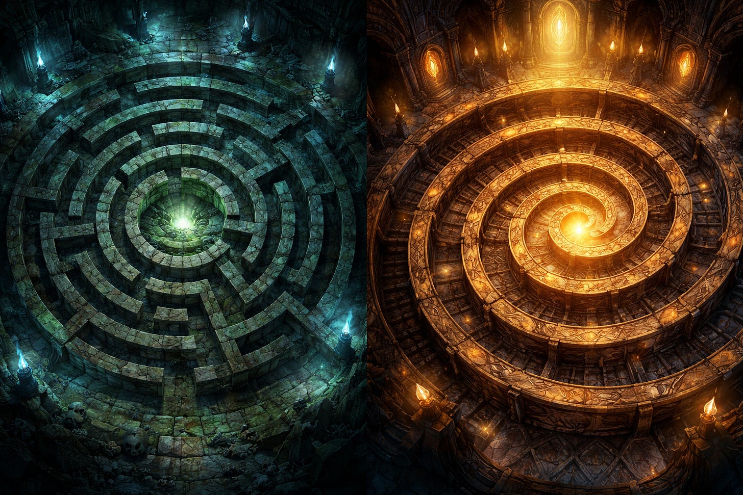 The first is the labyrinth. You have walked this one. You know it by the way your legs remember the effort while your eyes recognize nothing. By the way the map in your hand insists you are somewhere else. The labyrinth circles, yes — but it circles closed. Each return is not return at all. It is recapture. The path is not repeating. It is insisting.