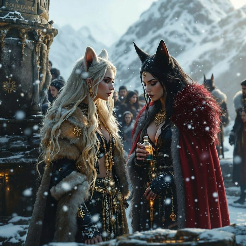 The falling snow slipped through broken arches and melted on the marble rim of the fountain, its flakes mingling with the steam that rose from the pool — a shimmering pool where many came to forget. Lanterns swung in slow arcs above the square, their light fractured through frost and smoke, glinting on feathers and fur alike.