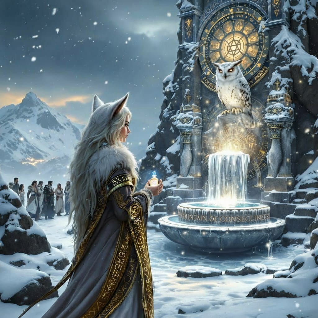 On the upper ledge of the fountain, beneath an arch rimed with frost, perched a white owl — Avestra, the Maven. Her eyes were twin moons in the dark, watching Lynx without judgment, without blinking.