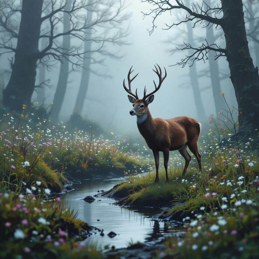 On a morning when mist clung to the valley like unspoken prayers, the Solaryn's amber gaze fell upon a Weary Deer lumbering through the shadows. The Weary Deer's coat mirrored the map of his journey—dappled brown where joy had touched it, silver where grief had blessed it with wisdom. His eyes were of a soul that had once glimpsed its own magnificence but turned away, afraid and broken. He had wandered far, carrying mistakes that could not be undone, regrets that clung like thorns. The Weary Deer did not see the spring, nor did he yet long for it, but his path crossed the Solaryn’s.