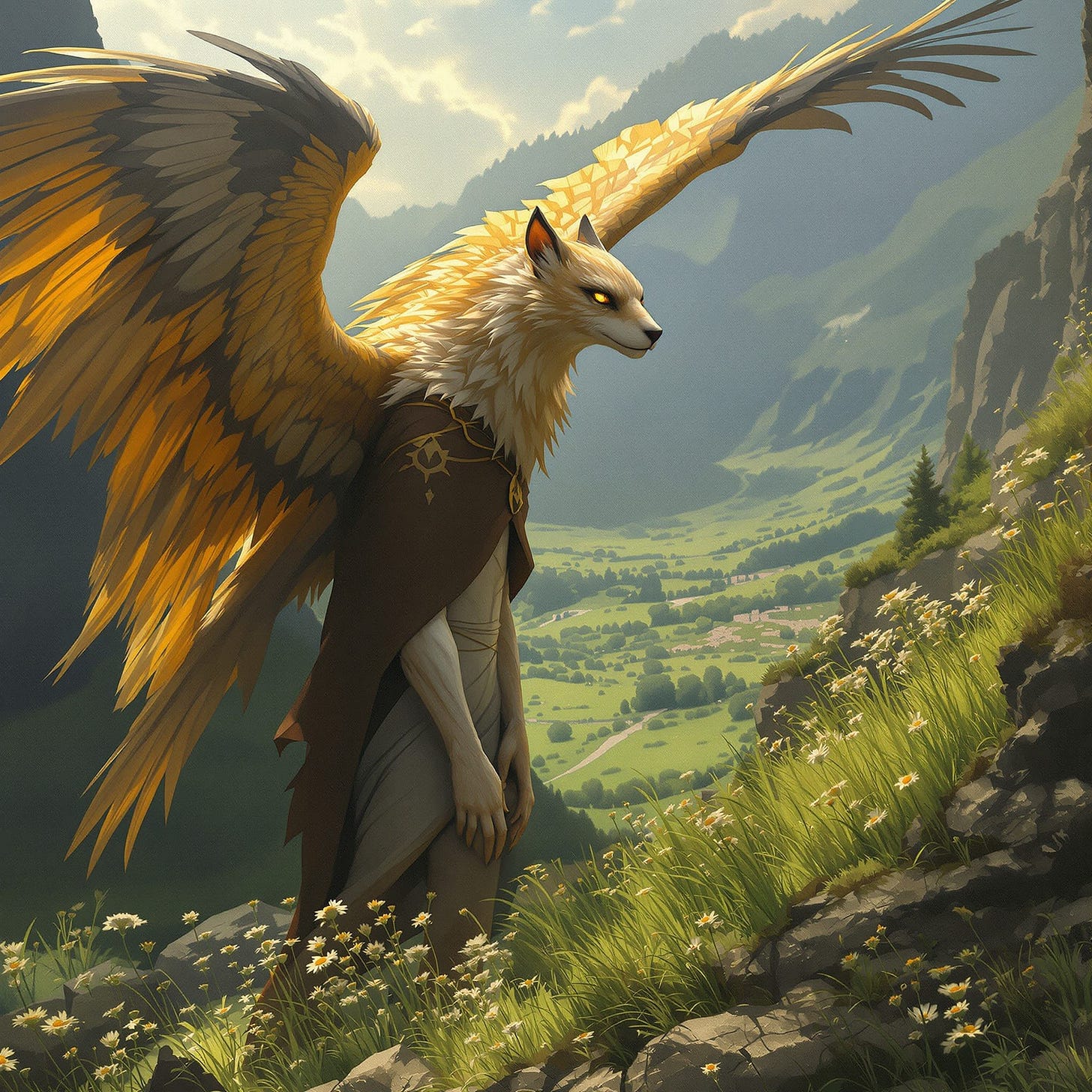 In those ancient days, the Solaryn kept vigil over the valley, a creature of mountain lion strength, golden eagle wings, and eyes that glowed with quiet warmth. She was a being woven from contradictions made whole. Her heart carried courage and strength, tempered by wisdom, compassion, and patience learned through many journeys.